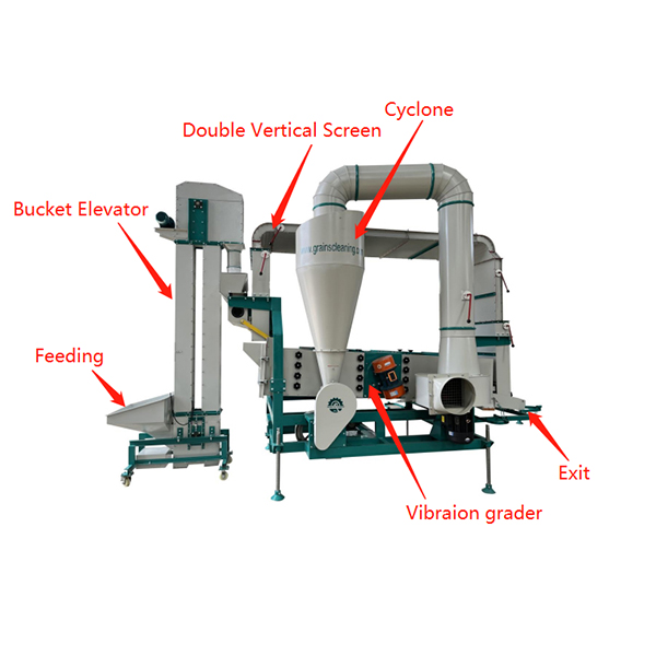 It consists of Bucket Elevator, Dust collector, double Vertical air Screen, vibration box and Sieve.